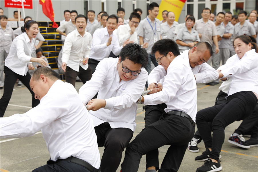 步履铿锵,气势如虹迈着时代的步伐,踩着音乐的节拍在国旗护卫队的护卫下鲜艳的五星红旗缓缓进入操场,参加此次运动会的共有龙凤队,扬帆队,冲锋队,冠军队,梦之队,群英队,金盾队,狂浪队八支队伍,本次趣味运动会共分8个项目,名称分别为:士气展示、拔河、集体跳长绳、过河接力赛、带球赛跑、赶篮球接力跑、抛绣球、花样接力。新颖滑稽的比赛项目,使整场比赛充满了娱乐性,员工的参与热情十分高涨,整个活动精彩纷呈,每个人脸上都洋溢着笑容,极大的缓解了职工的压力,放松了心情。